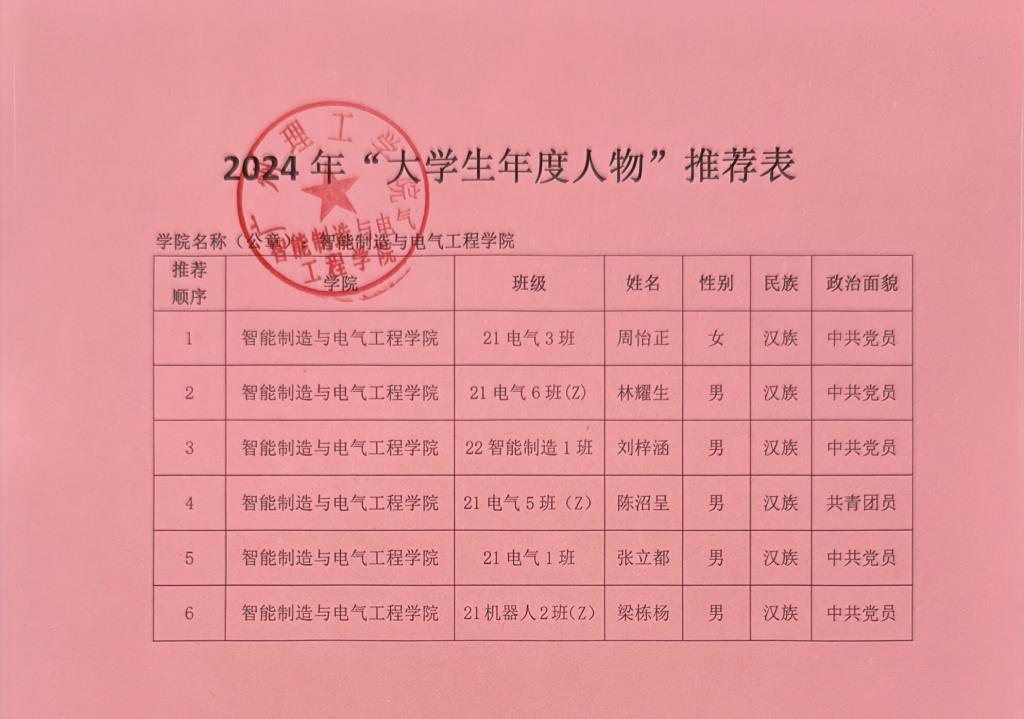 根据 《广州理工学院关于开展2024年“大学生年度人物”推选展示活动的通知》 (广州理工办函〔2025〕34号)文件精神,经个人申报,学院审核,拟推选周怡正等6位同学参加校级评选,现将评选结果公示如下: