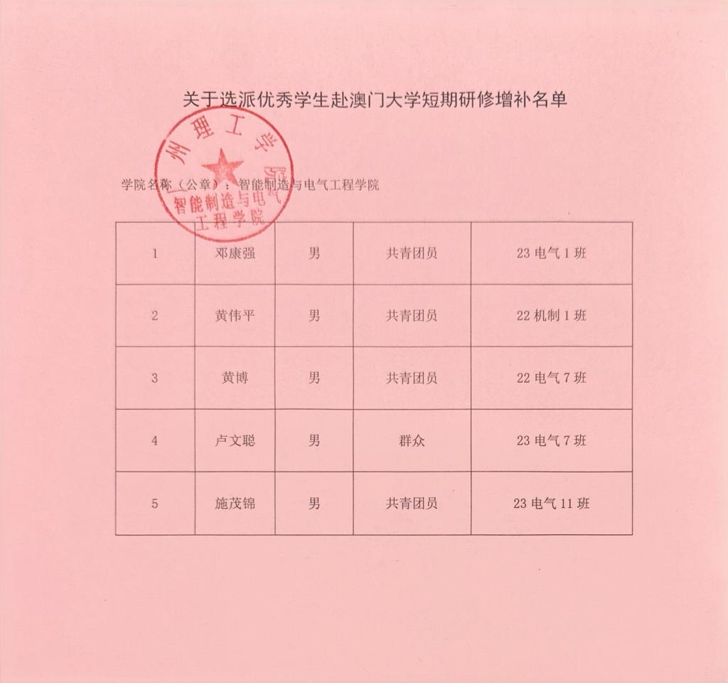 根据广州理工学院 《关于选派优秀学生赴澳门大学短期研修的通知》有关要求,我院组织申报,由学生本人提出申请、学院严格审核后提交学校。学校审核筛选出5名不符合条件的学生,现增补5名学生并予以公示,名单如下: