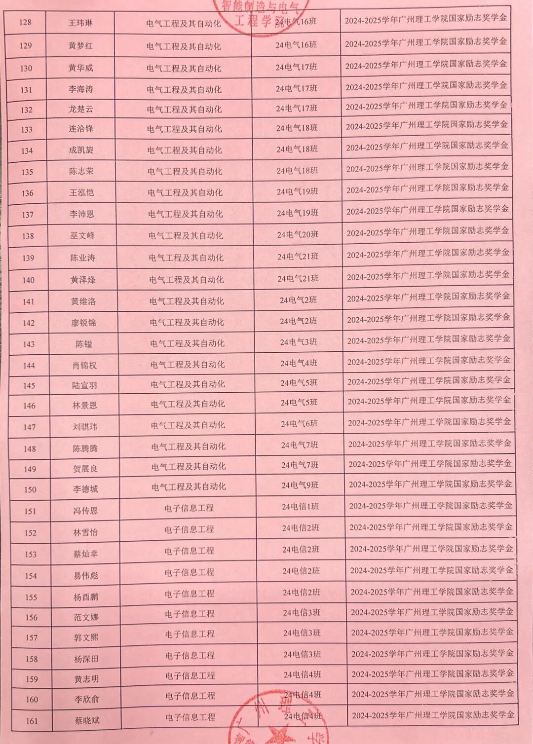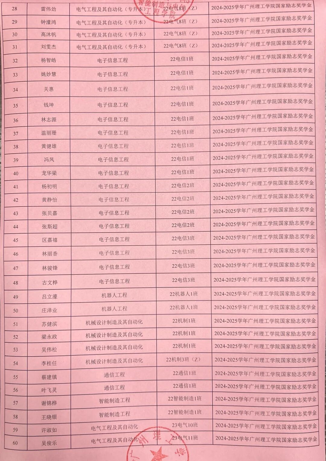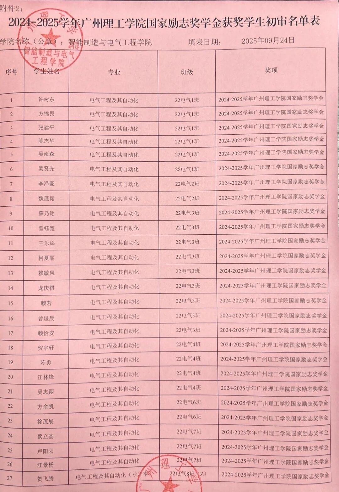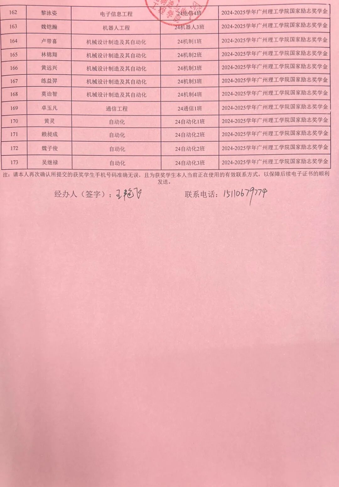 根据《关于开展2024-2025学年国家励志奖学金评选工作通知》(广州理工学助函〔2025〕11号),经学生本人申请及学院评议,现将我院2024-2025学年国家励志奖学金拟推荐名单在学院校园网主页、学院公众号予以公示。公示时间从2025年9月24日至2025年9月26日止。公示期间,任何个人和单位均可通过来信、来电、来访等形式向学院反映公示对象的情况和问题。反映情况时请签署真实姓名和联系电话,有具体事实;匿名将不予受理。