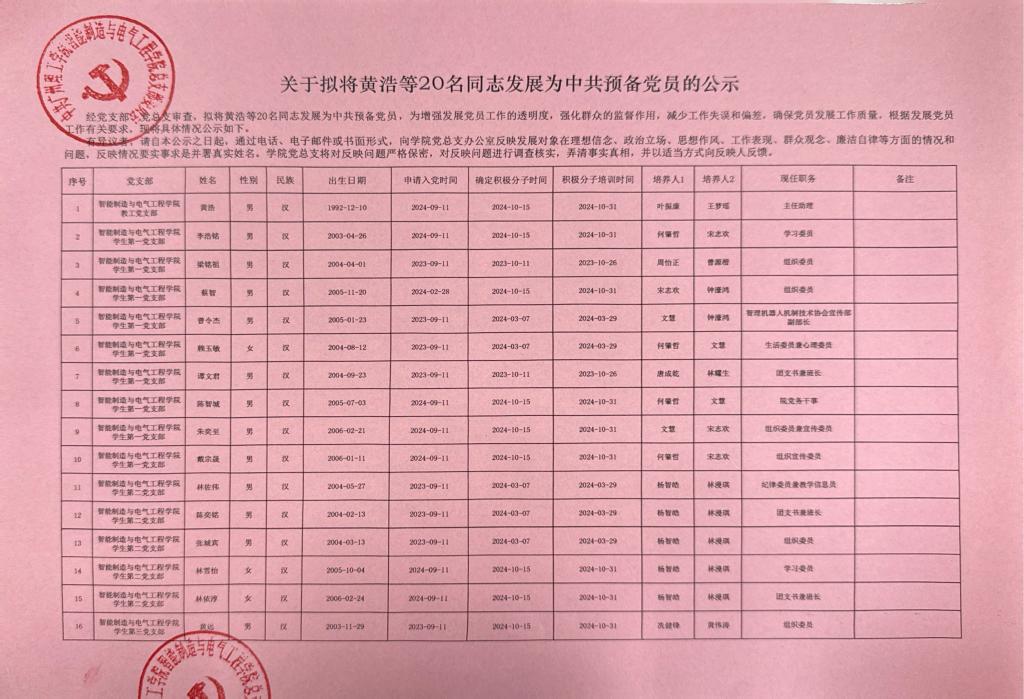 经党支部、党总支审查,拟将黄浩等20名同志发展为中共预备党员,为增强发展党员工作的透明度,强化群众的监督作用,减少工作失误和偏差,确保党员发展工作质量,根据发展党员工作有关要求,现将具体情况公示如下。